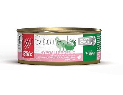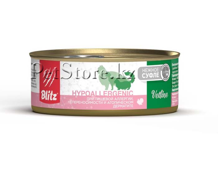 Корм консервированный Blitz Vetline Hypoallergenic полнорационный диетический для кошек при пищевой аллергии, непереносимости и атопическом дерматите.