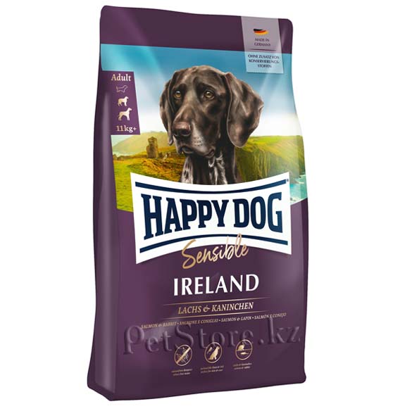 Всем лакомкам, которые любят нестандартный корм, очень чувствительны или разборчивы в еде, Happy Dog предлагает уникальную возможность: необыкновенно вкусный полнорационный корм класса супер-премиум Ireland, содержащий благородное мясо лосося и вкусную крольчатину.